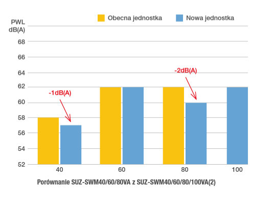 W porównaniu z obecną generacją, nowe jednostki Eco Inverter osiągają niższy poziom mocy akustycznej, zapewniając elastyczność instalacji w obszarach o gęstej zabudowie.